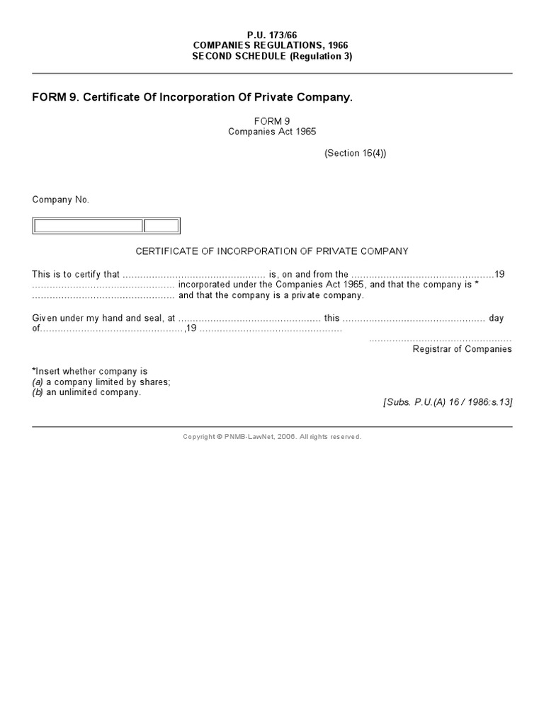 Form 9 Certificate Of Incorporation Of Private Company Companies Regulations 1966 P U Pdf Legal Concepts Copyright Law